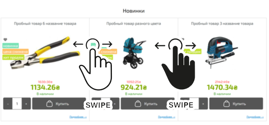 Теперь в наших виджетах товаров доступен эффект свайпа, который активируется при помощи кода :touch в настройках блока.